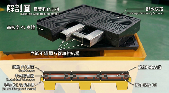 不鏽鋼管內嵌強化: 專用護蓋內部加裝不鏽鋼支撐管,完美結合了「PE 的耐酸鹼性」與「不鏽鋼的剛性」。即使長時間負重 1500 公斤,也能有效防止塑膠疲勞與下陷變形。
